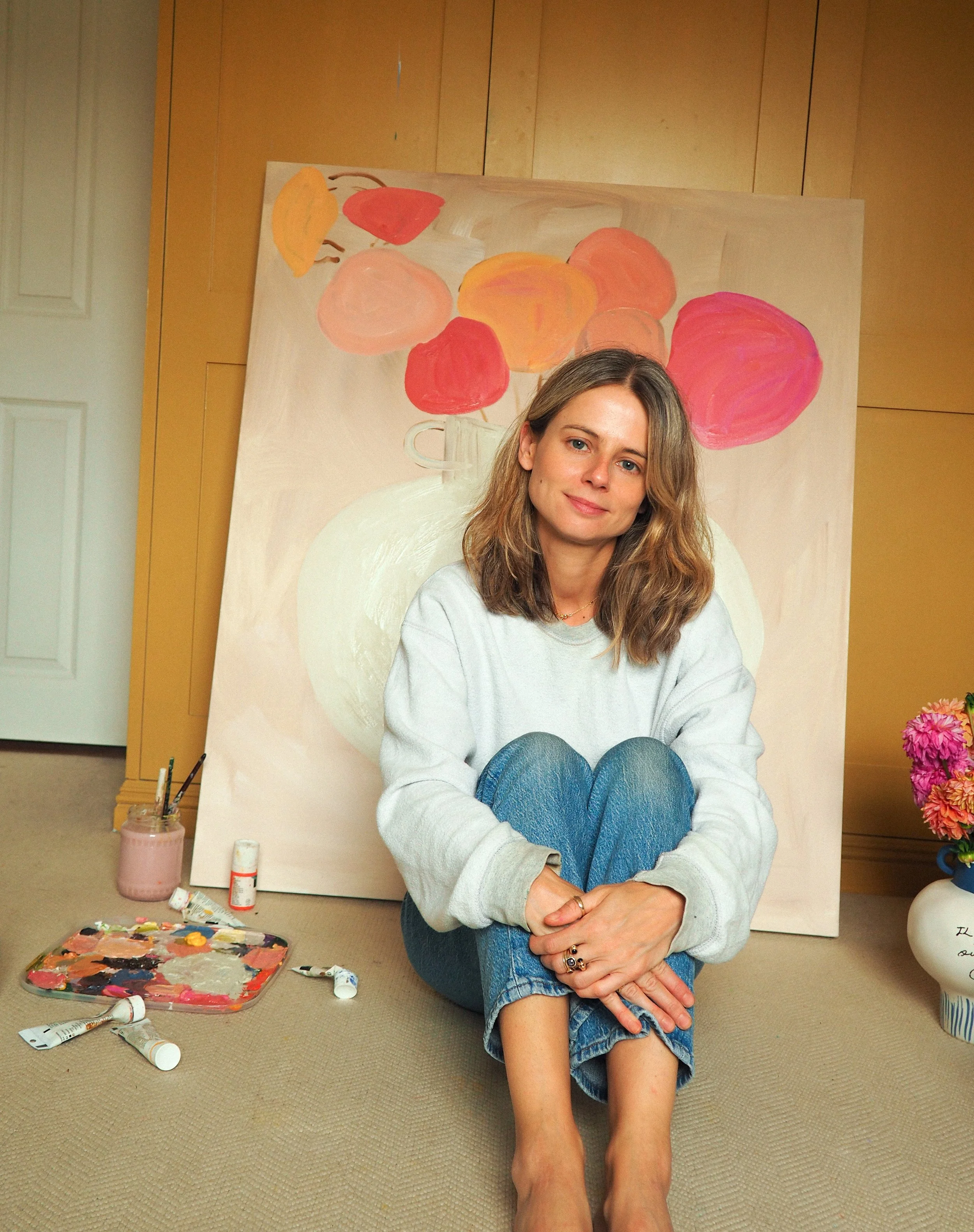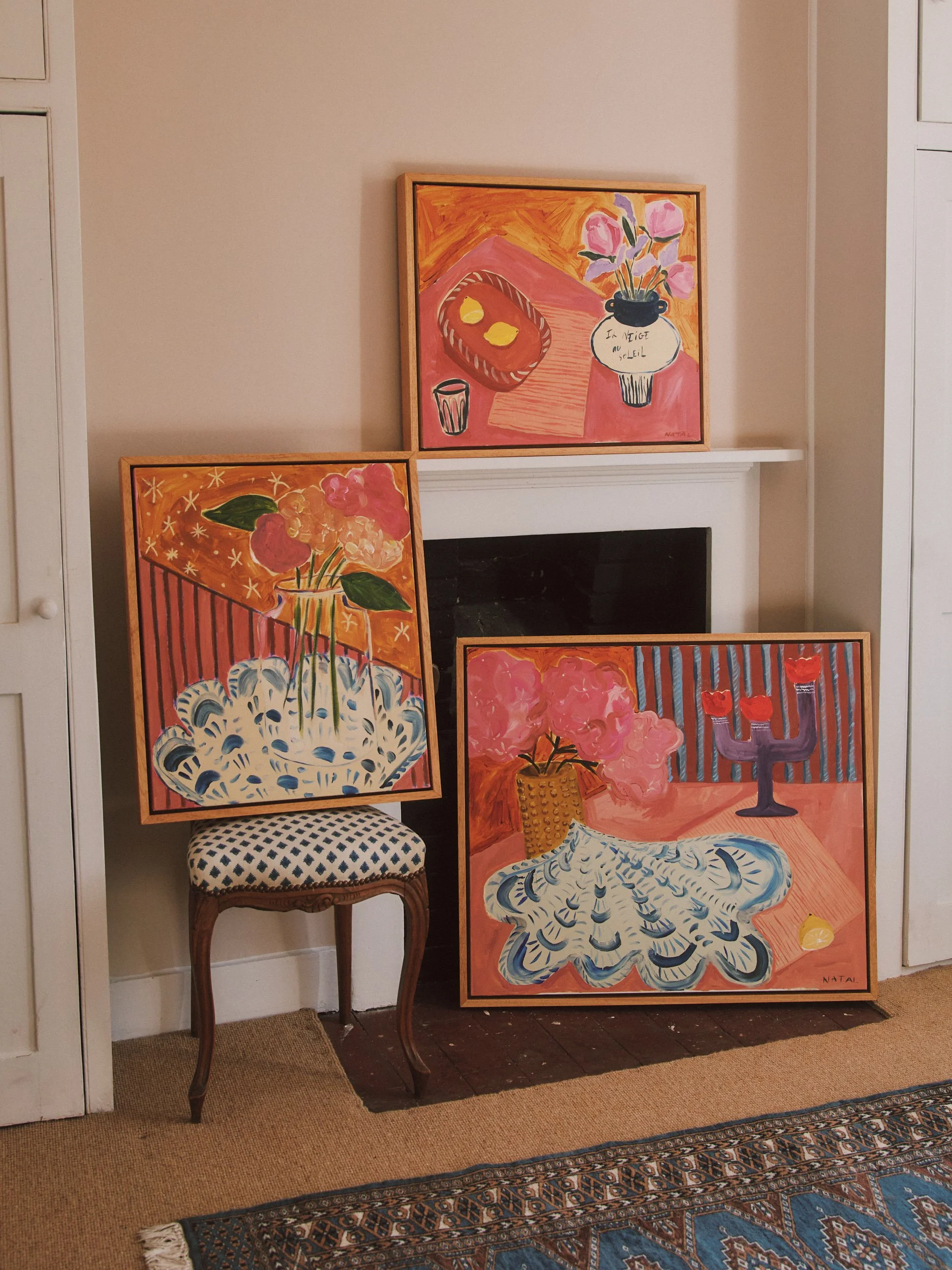 Her art is bold, feminine, painterly and aims to add whimsy and joy to domestic scenes with textured brush strokes, warm tones and colourful compositions.